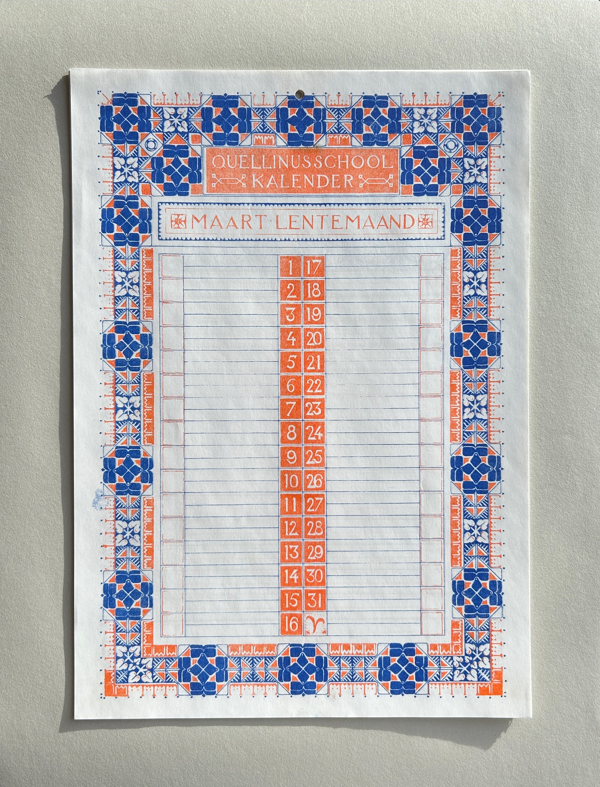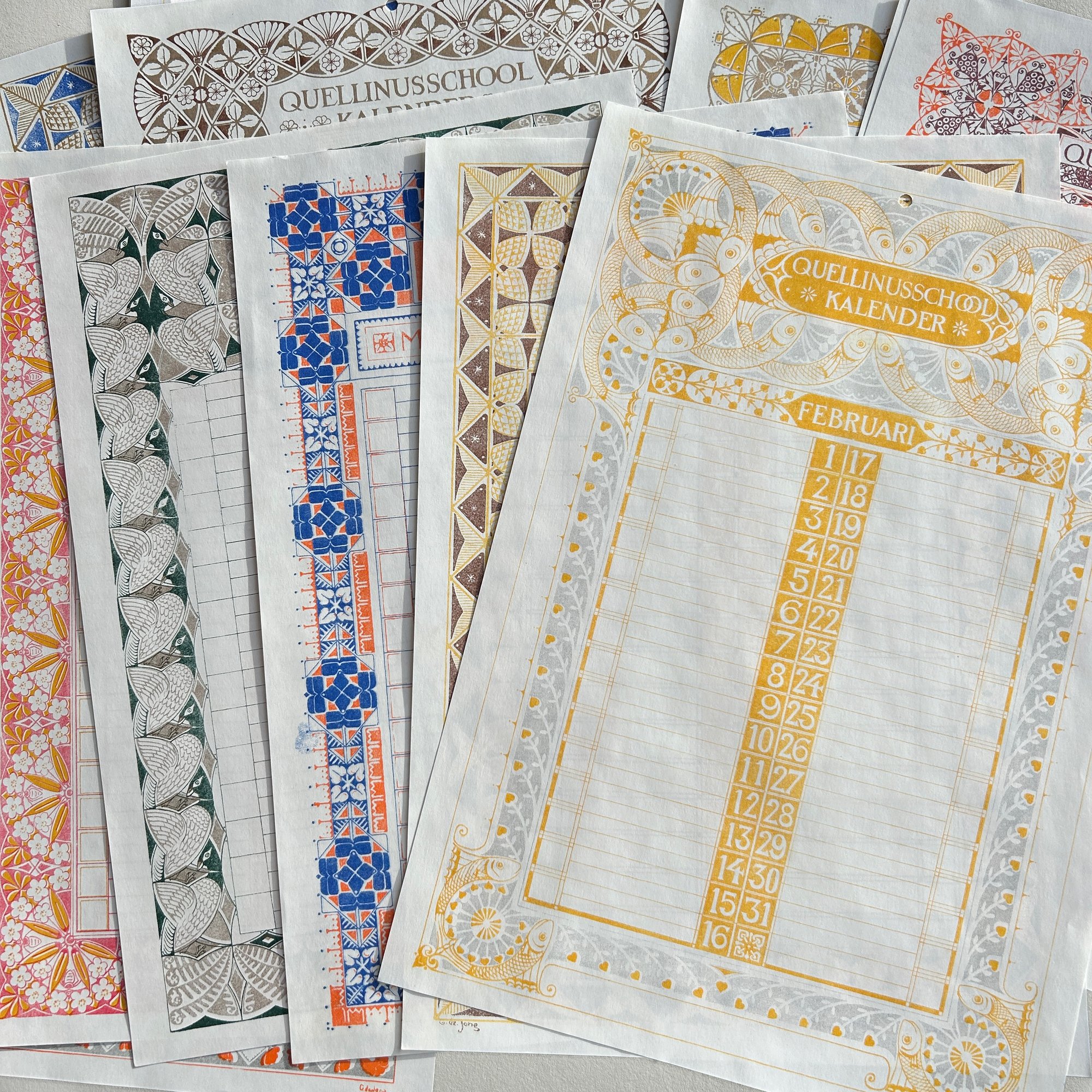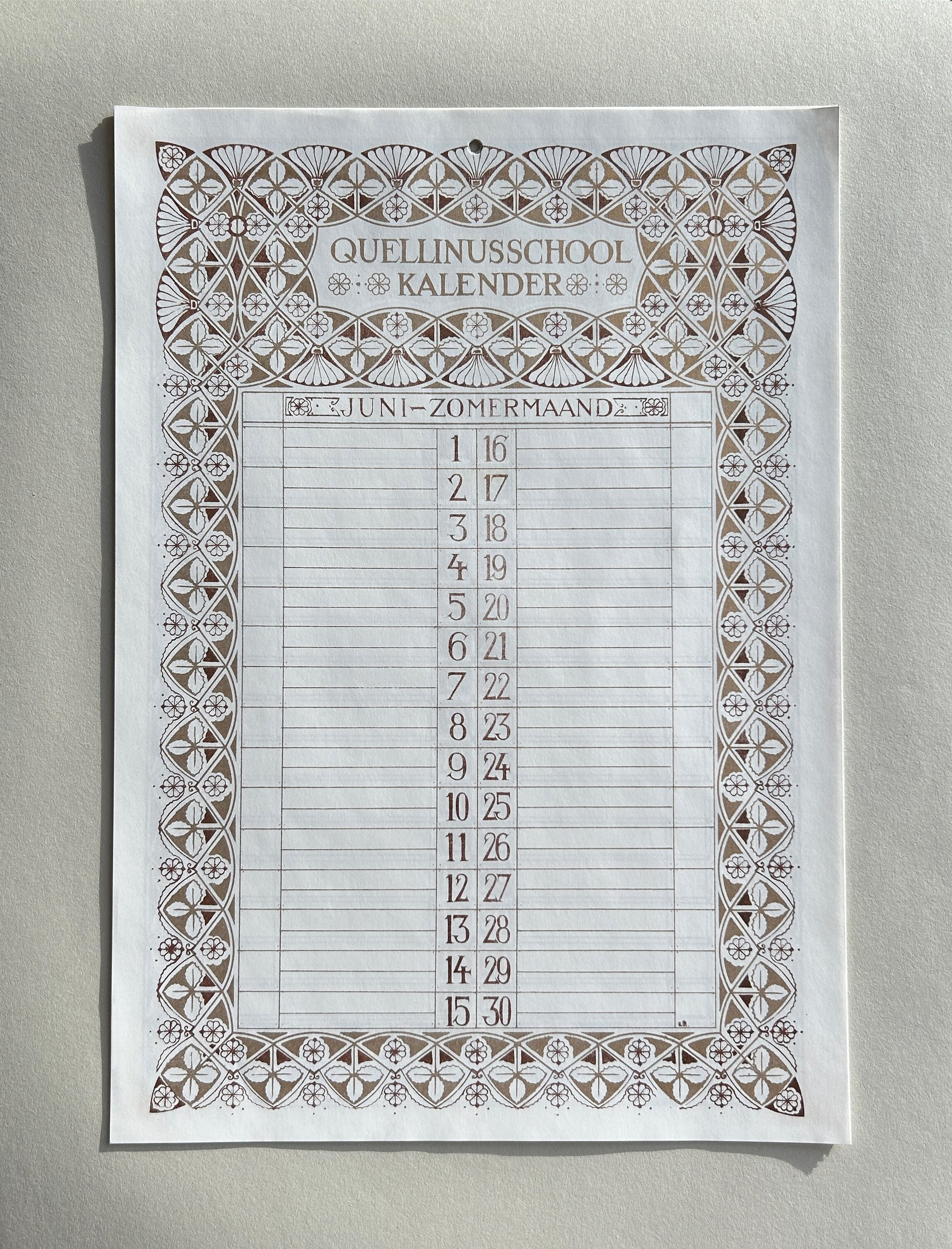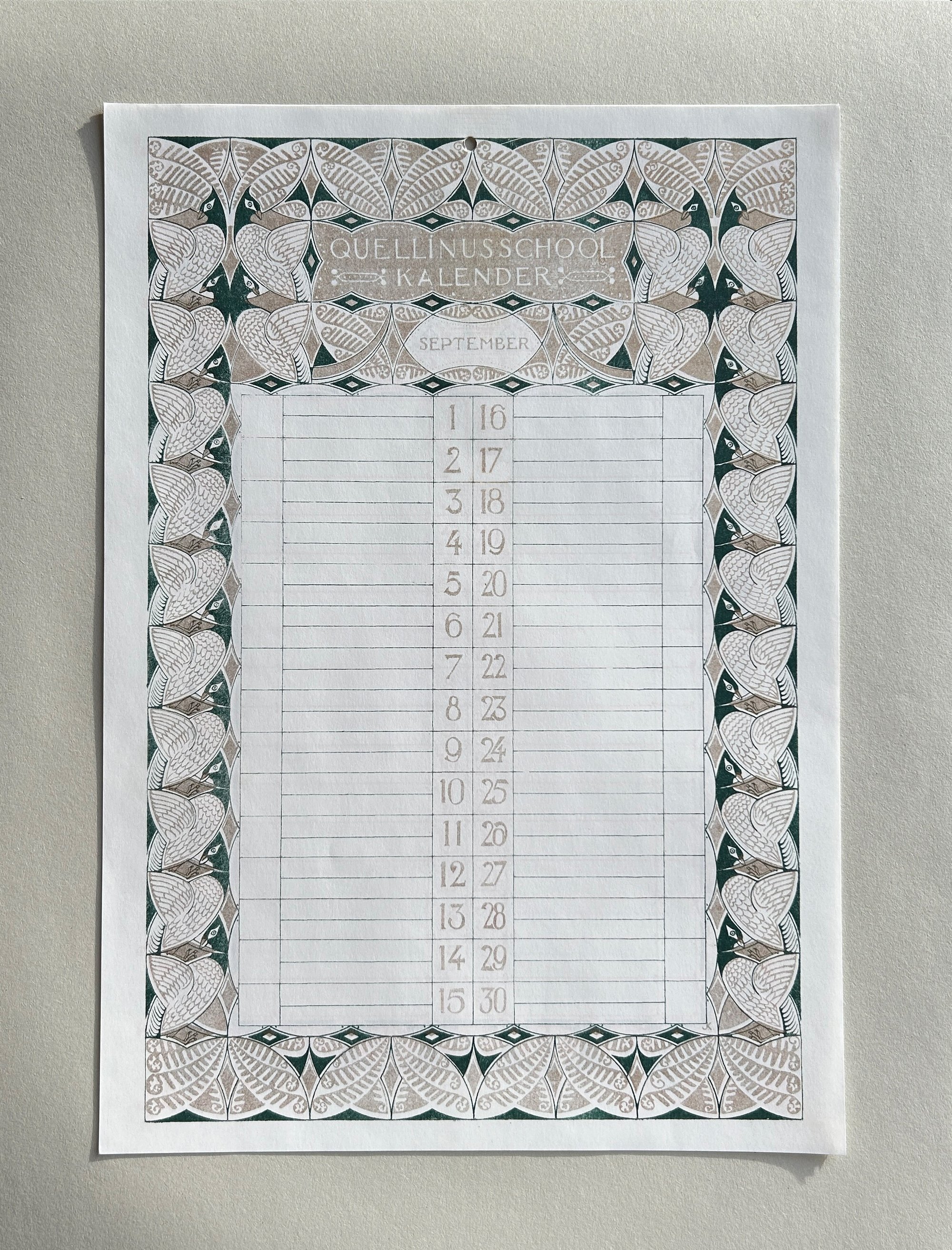 This calendar was produced in 1904 by students of the school. Each month features a unique two colour artwork in an art nouveau style, adorned with, plants, leaves, acorns, peacocks, fish and flowers.