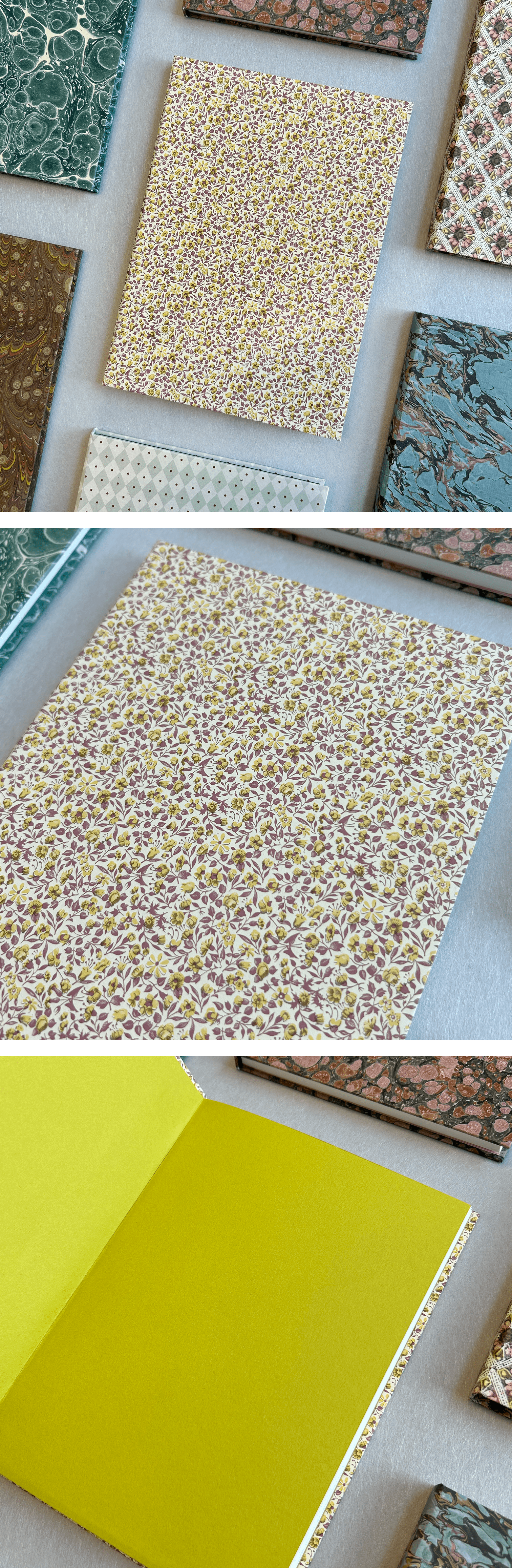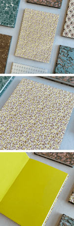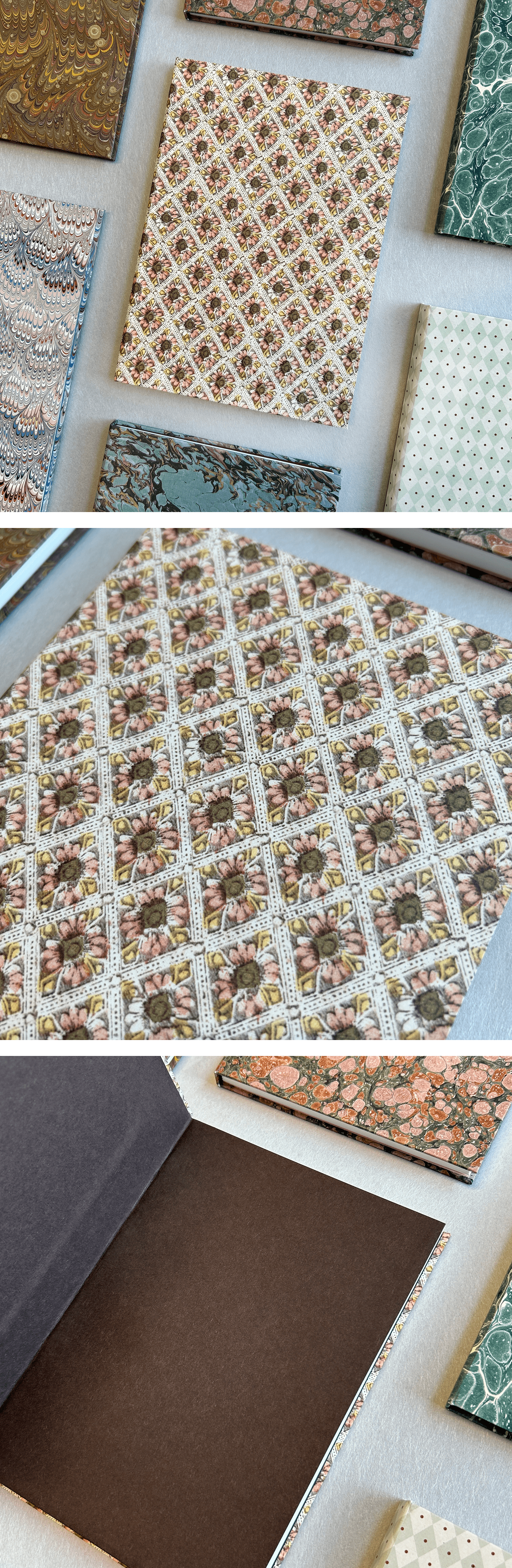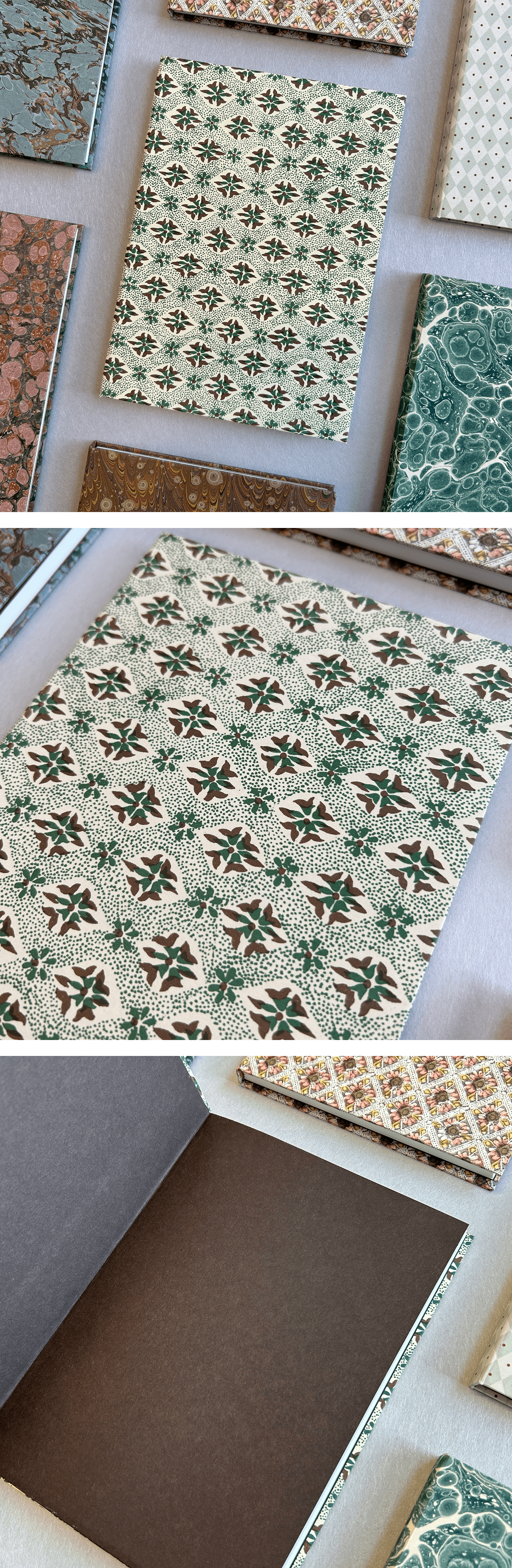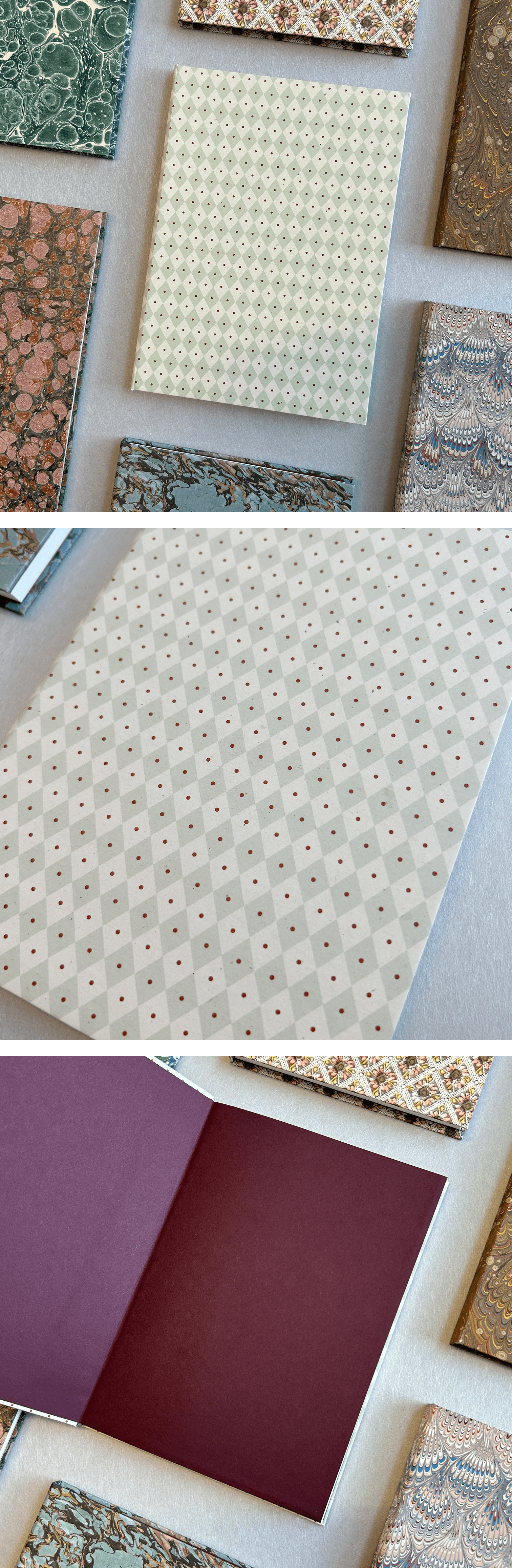 80 plain pages, hand sewn and bound in digitally printed patterned paper