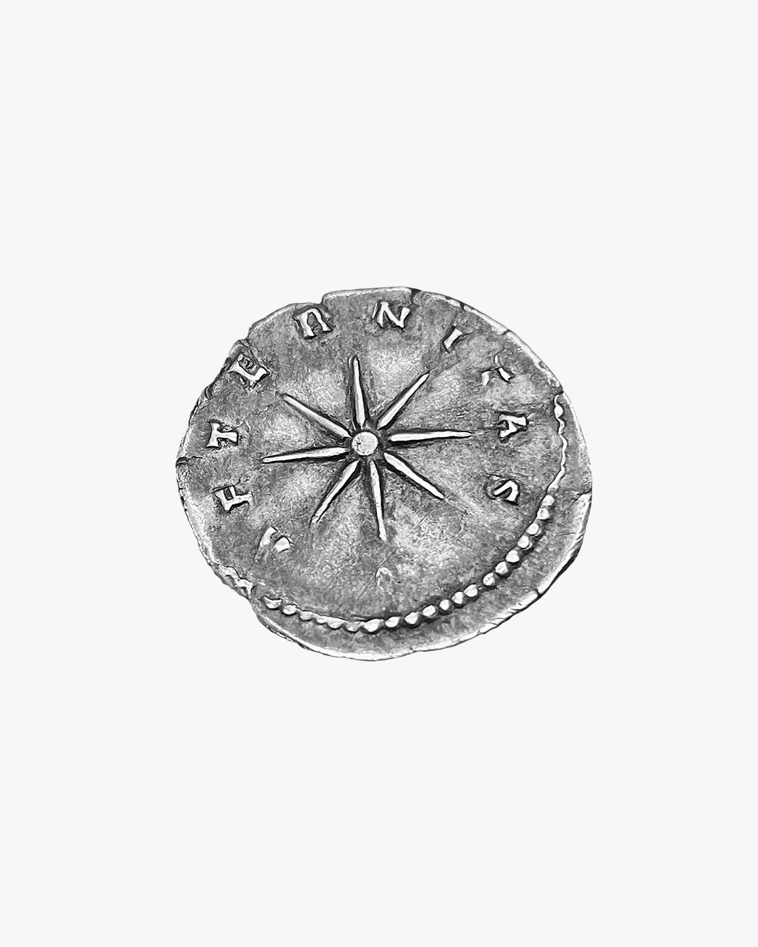 Design from a Roman silver denarius from 140AD commemorating Faustina the Elder, wife of the emperor Antoninus Pius. The coin features a shining star and the inscription ‘Aeternitas’ meaning ‘eternity’.