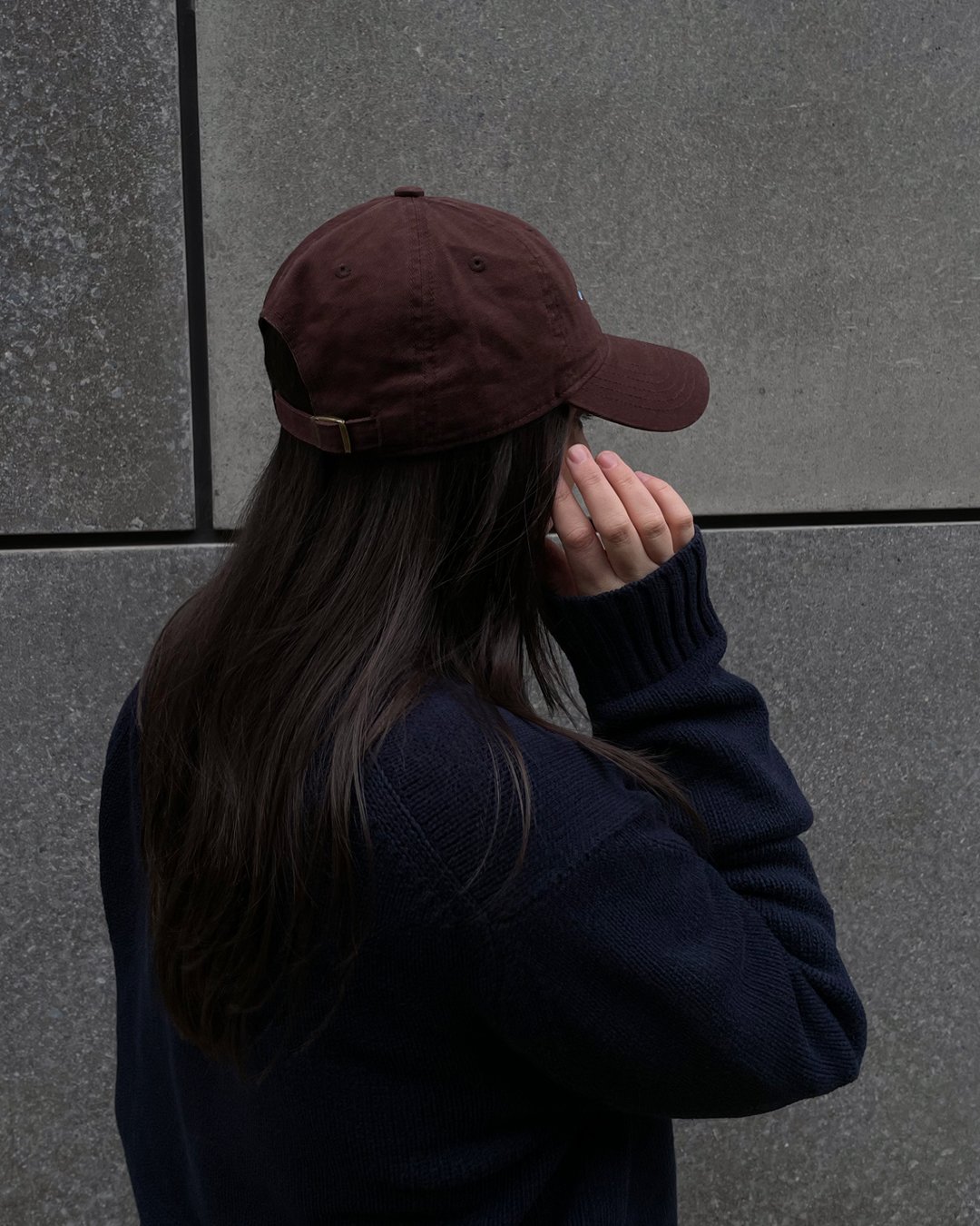 Chocolate brown baseball cap with light blue embroidery