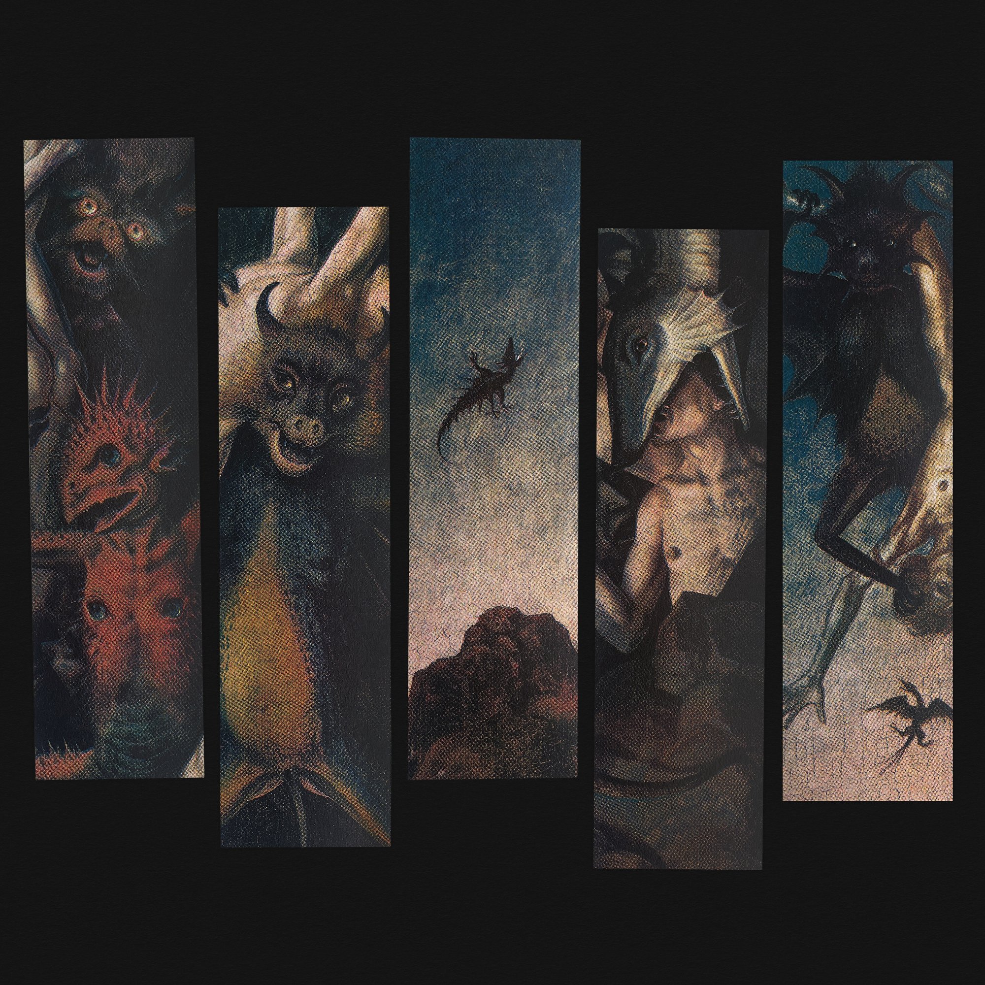 4 colour Risograph printed bookmarks featuring artwork from The Fall of the Damned, painted by Dieric Bouts in 1470.
