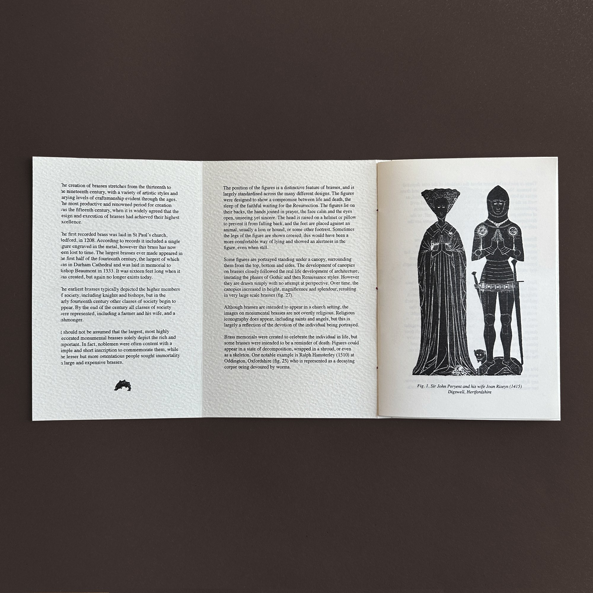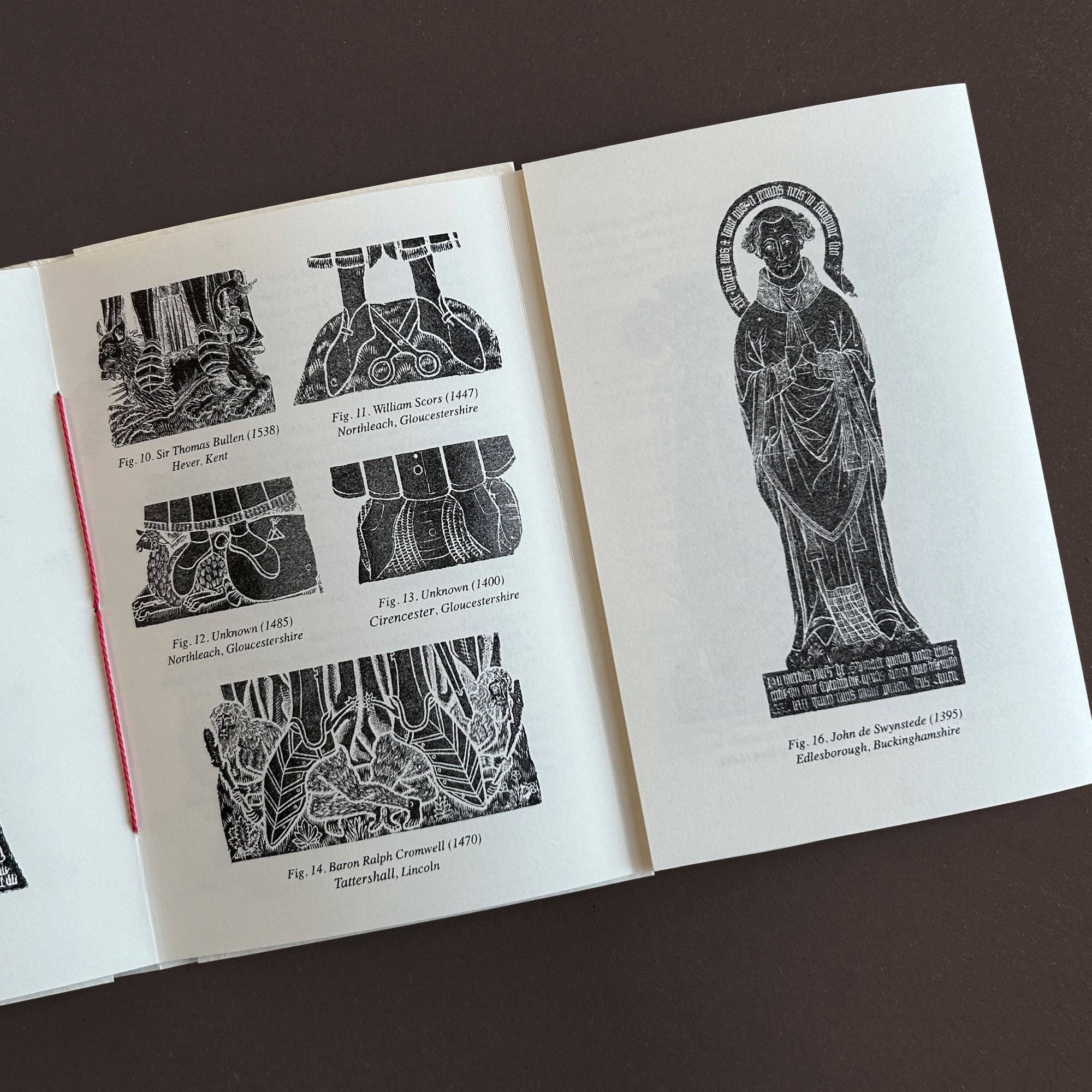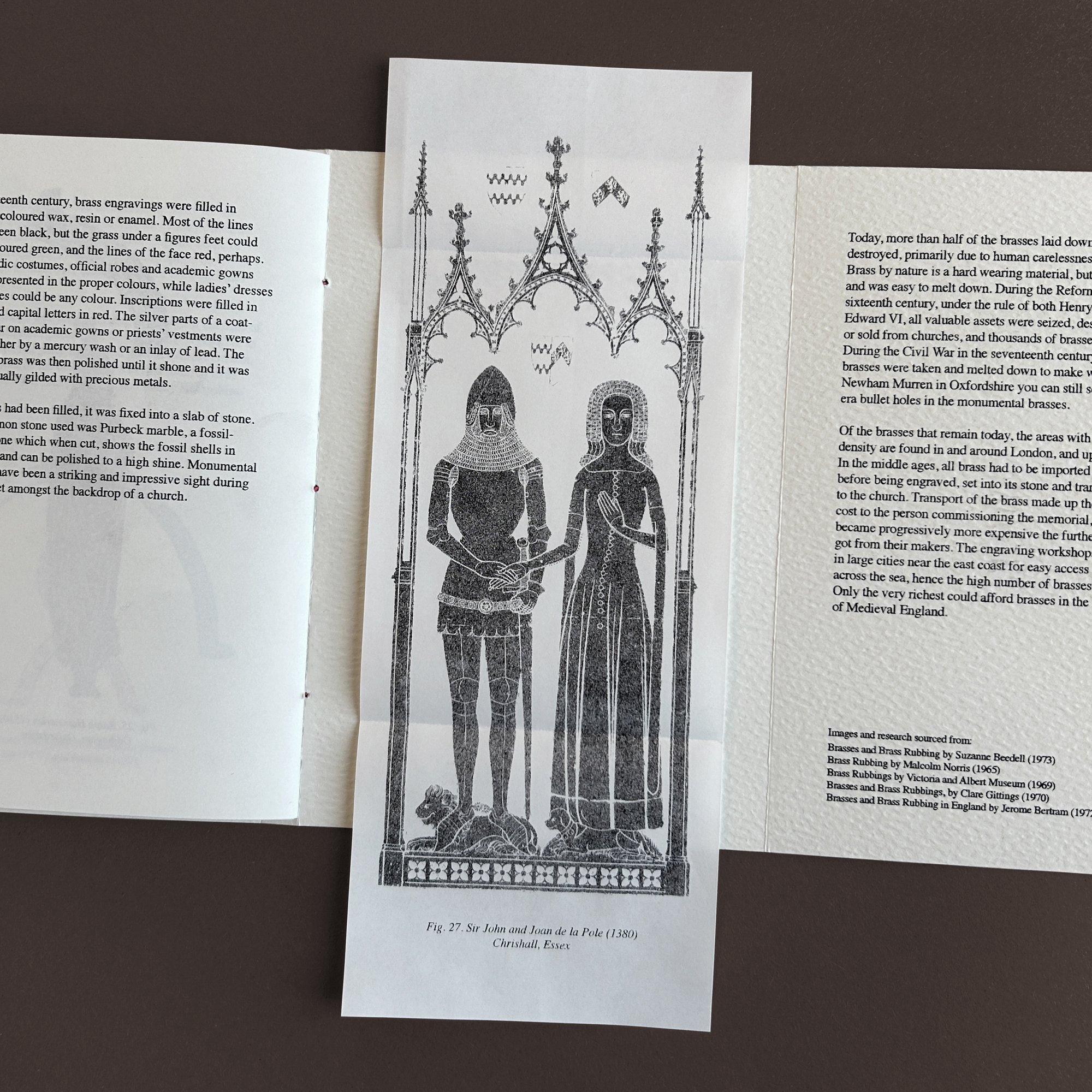 A6, 20 pages printed in black Risograph with a fold-out cover and concertina inner pages. Bound with red thread. Includes a separate Riso print of a brass rubbing made from the monument of Sir Richard Attelese (1394). Print also available separately - see other listings.