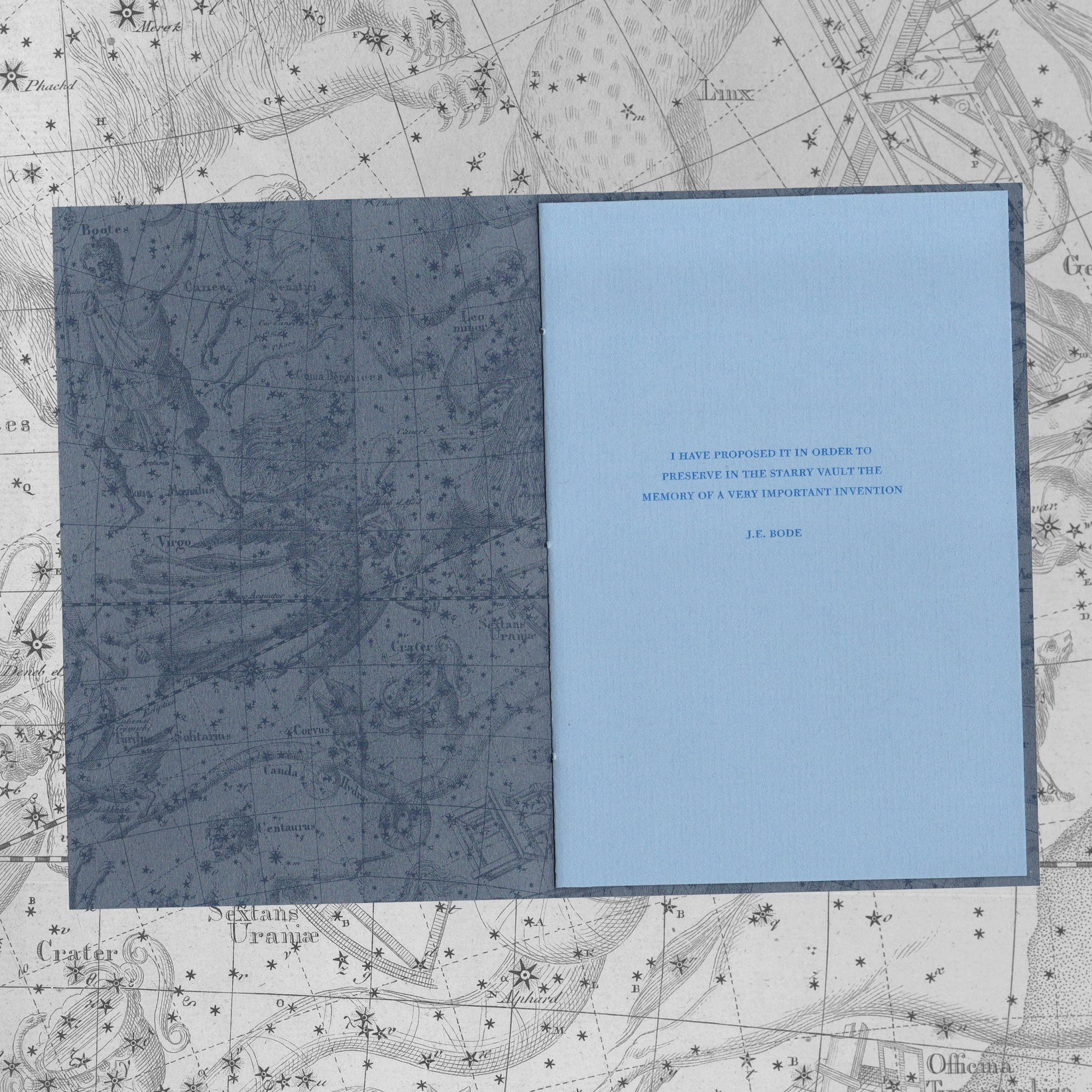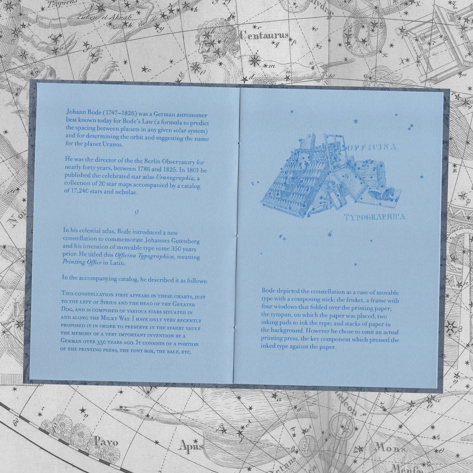 In 1801, German astronomer Johann Bode published his celestial atlas, titled Uranographia, comprised of 20 star maps and a catalog of 17,240 stars and nebulae. With its publication, Bode introduced a brand new constellation to honour Johannes Gutenberg's invention of moveable letterpress type.