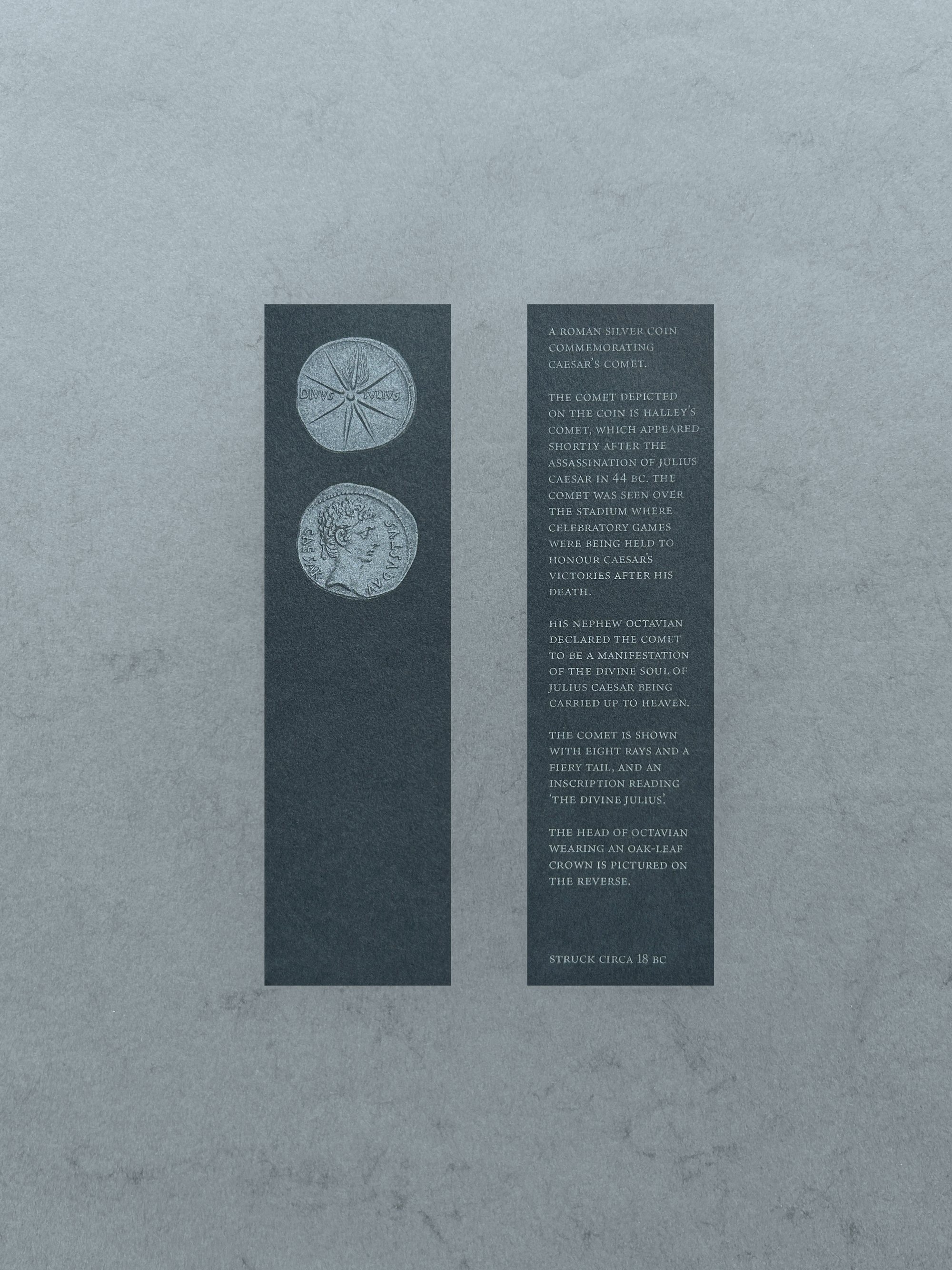 A Roman silver coin commemorating Caesar's Comet. The come depicted on the coin is Halley's Comet, which appeared shortly after the assassination of Julius Caesar in 44BC. The comet was seen over the stadium where celebratory games were being held to honour Caesar's victories after his death.