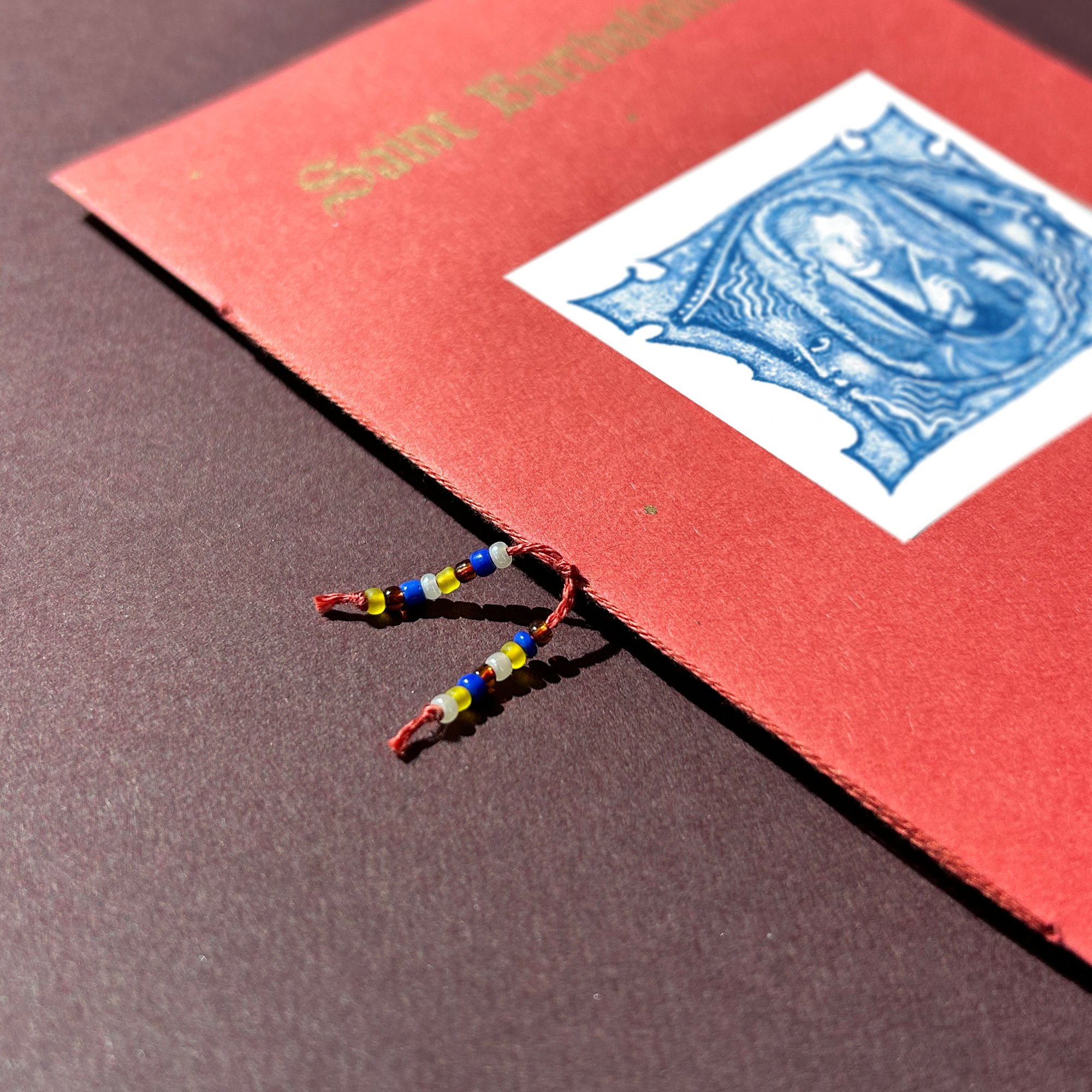 A6, 12 page booklet printed in red Risograph on cream laid paper. Cover printed in metallic gold ink, featuring a 4 colour print in yellow, metallic gold, red and blue Riso. Bound with thread and glass beads.