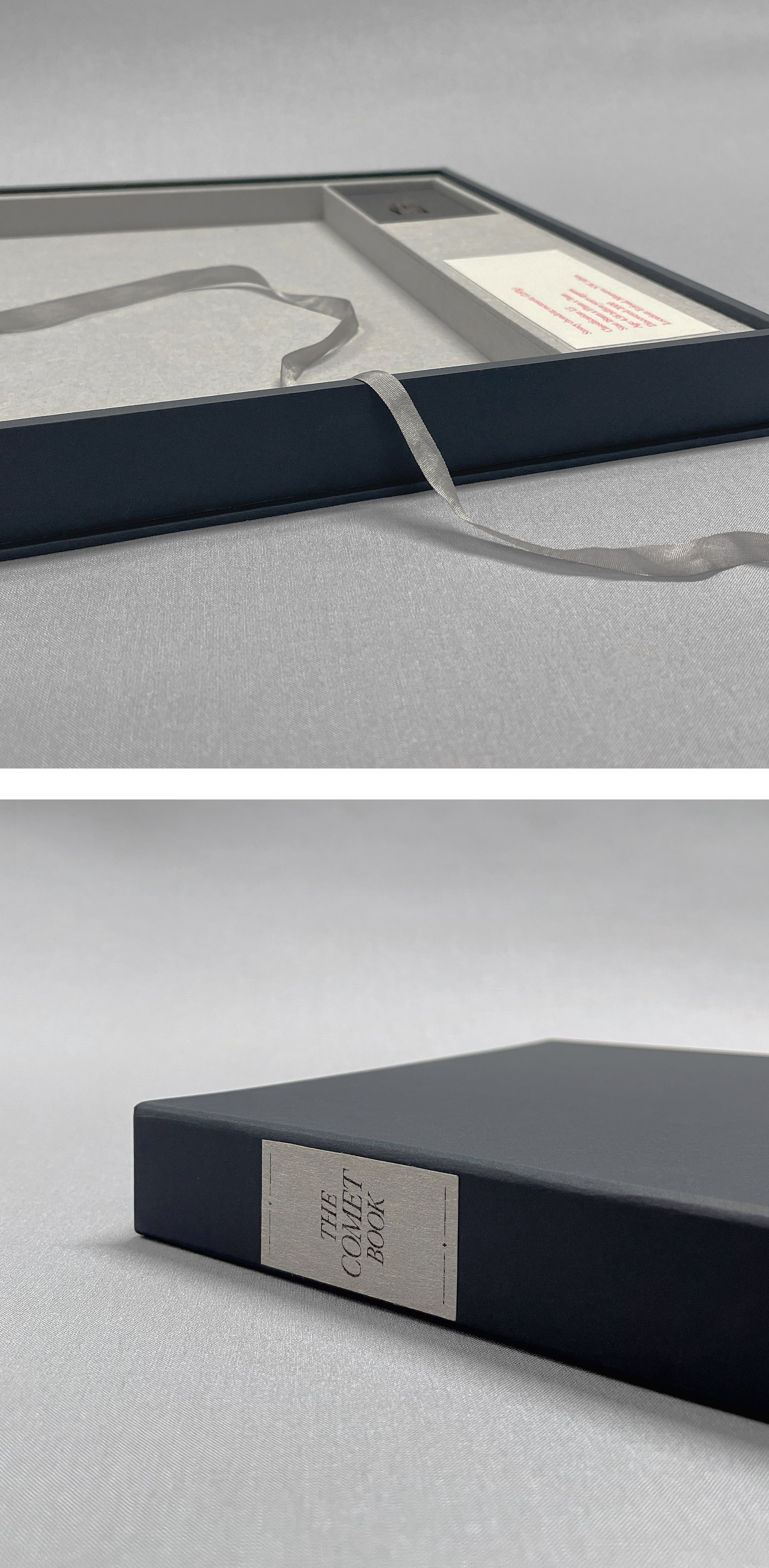 The book is housed in a double walled tray with a silk ribbon to lift. The lining of the lid includes a paper slip pocket containing an additional print sourced from the original Comet Book that was not included in the republished edition.