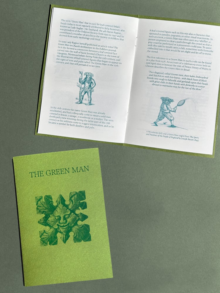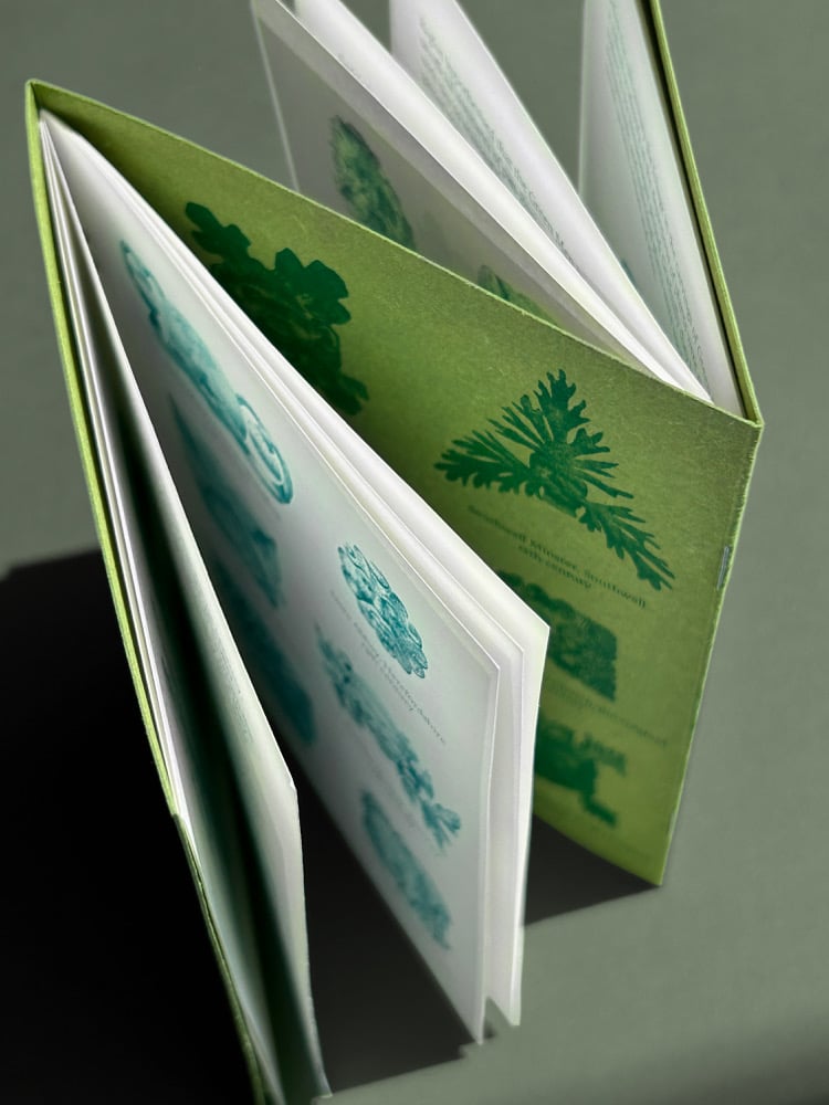 A6, 24 pages printed in green and teal Risograph, bound in a dos-à-dos concertina cover.
